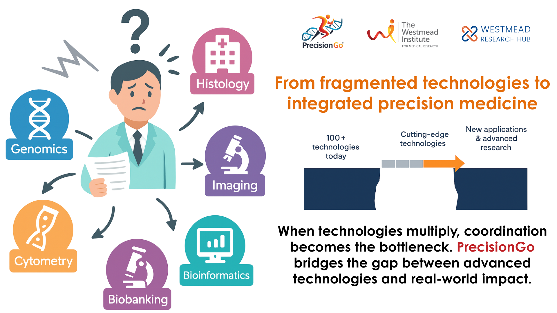 Precision medicine research often breaks down at the seams between technologies, teams, and workflows. PrecisionGo is designed to close those gaps.